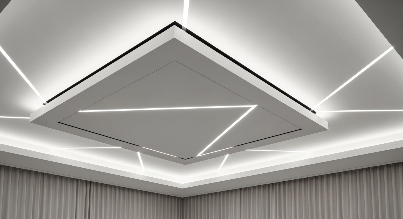 Минималистичный потолок с теневым швом, аккуратными нишами и линиями света выглядит дороже и актуальнее, чем стандартный вариант с плинтусом и одной люстрой.